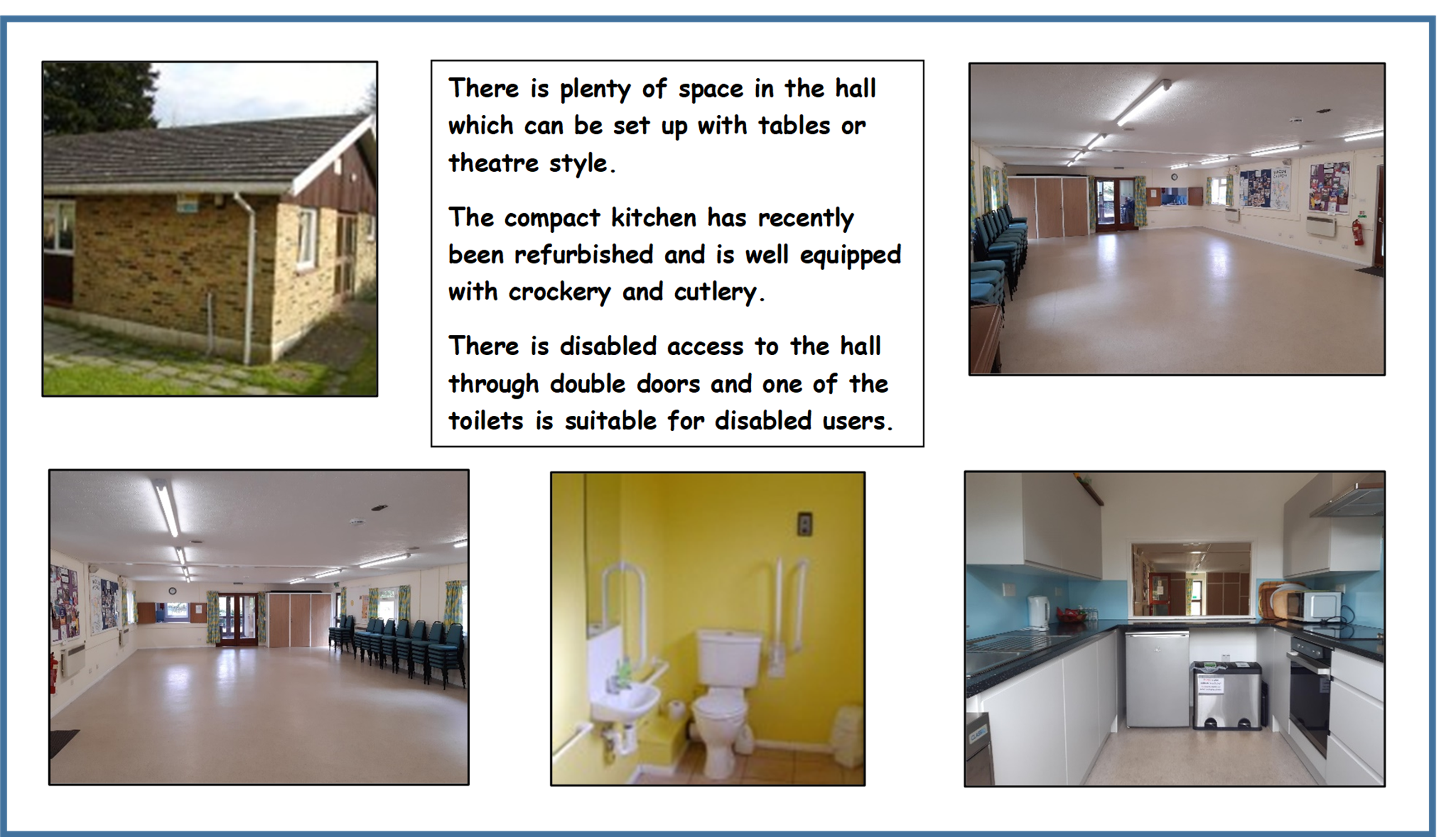The main room is 23 ft wide by 44 ft long ; it is possible to seat 64 people on 8 tables of 8, or 80 people without tables. The compact kitchen has a double drainer sink, oven with ceramic hob above, and a microwave. There is a sound system with integrated ceiling mounted microphone and also an induction loop for the benefit of people using hearing aids with a ‘T setting’.